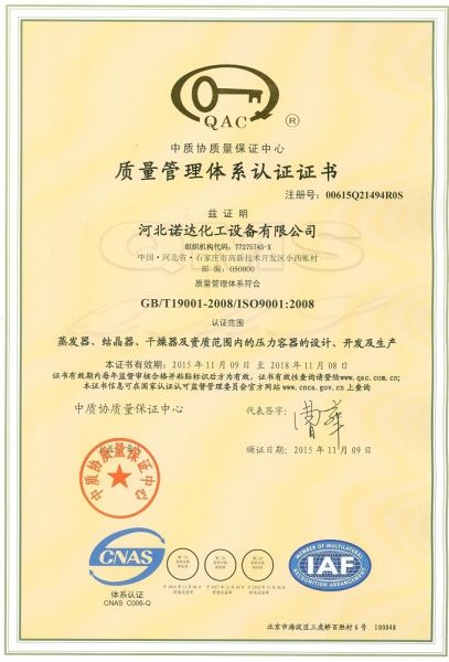 河北诺达化工设备有限公司是一家致力于为客户提供完善的高盐废水零排放一体化解决方案,为客户提供优秀的MVR蒸发、工业连续结晶、干燥等单元操作设备和EPC服务的新型现代化高新技术公司。 公司长期致力于蒸发结晶领域的理论研究与工程实践,是大力发展工业连续结晶并作为主营业务进行推广的企业,独立或合作申请各类连续结晶发明及实用新型专利20余项,极大地推动了国内工业结晶过程向连续化、自动化转变的进程,长期保持着国内工业连续结晶的领头羊地位。通过对蒸发及工业连续结晶数十载的技术积累,我们系统地解决了MVR蒸发器结晶颗粒小,不易过滤,易堵管,蒸发强度低等诸多问题,产品深受用户好评。 公司运用现代化管理理念,注重技术战略,集中了化工工艺、过程装备、控制工程等不同领域的高级专业技术人才。具有完善的设计开发能力,...... [ 查看详情 ]